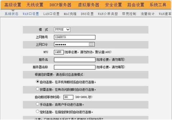 进入高级设置中的WAN口设置。如果宽带服务需要拨号请选择PPPOE拨号,否则可以选择DHCP自动获取。PPPOE拨号要输入宽带账号密码,连接模式选择自动连接。DHCP自动获取则不用填写。